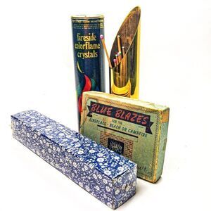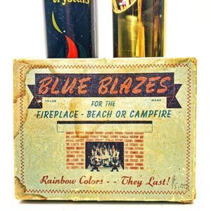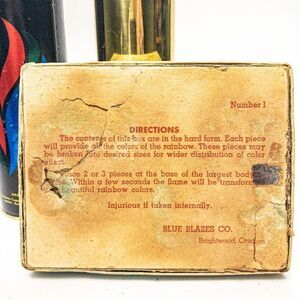- a vintage box Blue Blazes, Brightwood, OR, For the Fireplace - Beach or Campfire, “rainbow colors, they last.” The box shows a lot of wear, crystal chunks are minimally used. No guarantee that these crystal chunks will work as intended, due to age.