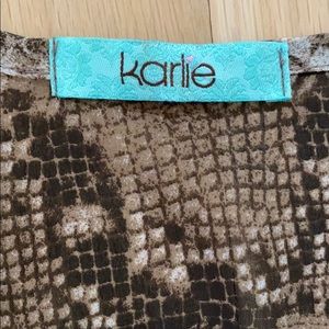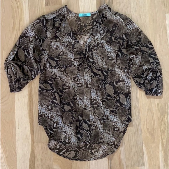 Semi-sheer, lightweight polyester, python print blouse. Two pockets on front with gathered tab sleeves. Blousy but not oversized!