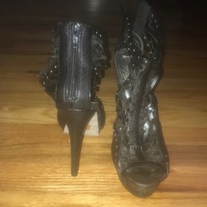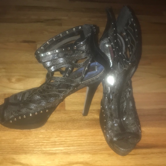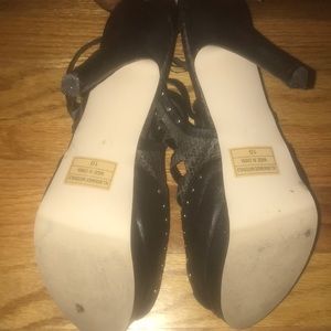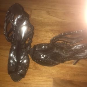 Black strappy sandals. Inner straps across foot are snake skin pattern black grayish color. Hint of silver. Zipper in the back