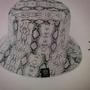 Contemporary bucket hat accented with python print.
