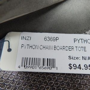 Python Chain Border Tote bag faux python, new with tags, from Lori's the sole of Chicago. Orig 95.00, Measures 14 1/2"Tall x 15" Wide x 3 1/2" deep. Foldover Bag, Interior zip pocket and slip pockets. Can wear as a handbag or a shoulder bag
