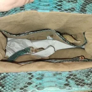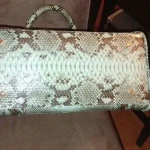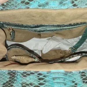 This stylish Grand Pelle turquoise genuine python leather print handbag is perfect for any occasion. Its unique design and elegant color makes it a standout accessory. Ideal for adding a touch of sophistication to your outfit. Removable strap. Gold tone hardware still in the protective plastic. Can carry this as a satchel or a convertible handbag. Exclusive and sold out color. Grand Pelle utilizes the belly of the python to make it more durable, as this is not embossed. Currently selling for $650 online. Thank you! 🩵