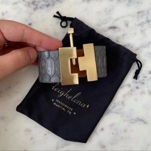 Such a lovely piece of jewelry! Handmade with genuine exotic python skin on leather and a nickel-free aluminium alloy buckle in Austin, Texas. This Leighelena Jewelry cuff comes apart and goes together like a puzzle. It has a very sturdy clasp and modern and beautiful design. This unique cuff truly is a statement piece that you will treasure forever.