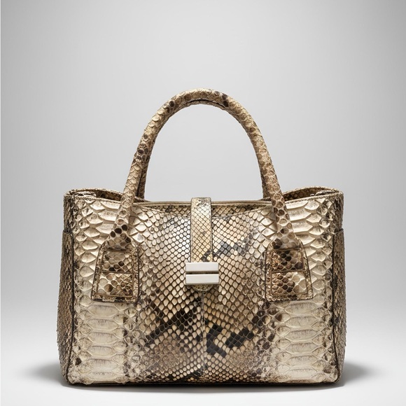 Elevate your style with this elegant python-print handbag. Its luxurious design and versatile tan color make it a perfect accessory for any outfit.
