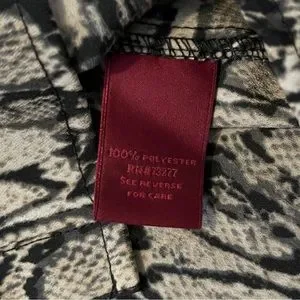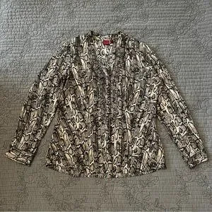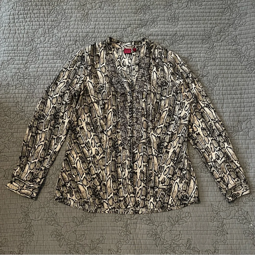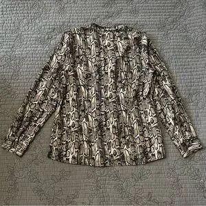 Animal snake print button up blouse in excellent pre owned condition. Approximate flat measurements are 16“ shoulder to shoulder, 20.5“ armpit to armpit, 23.75“ shoulder to sleeve, 18.5“ waist, and 23“ in length from shoulder to bottom hem.