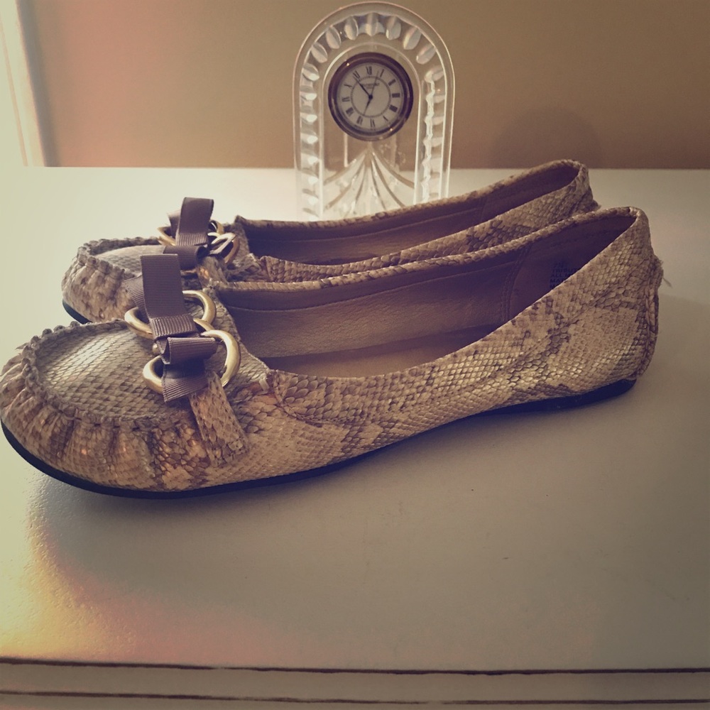 Gold python print flats with gold chain and ribbon detail across the toe. Non slip rubber sole. Put some sparkle in your step ✨✨✨