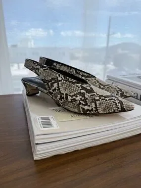 Python print leather slingbacks with small heel. Brand new, never worn because they’re too small on me and I missed the return window. Marked 8.5 but would best fit a size 8.