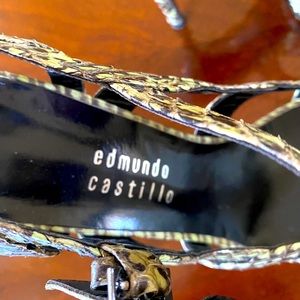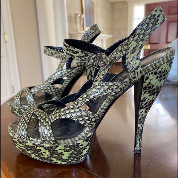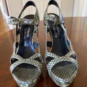 Beautiful 5” platform green and black python heeled sandals, by shoe designer Edmundo Castillo.
