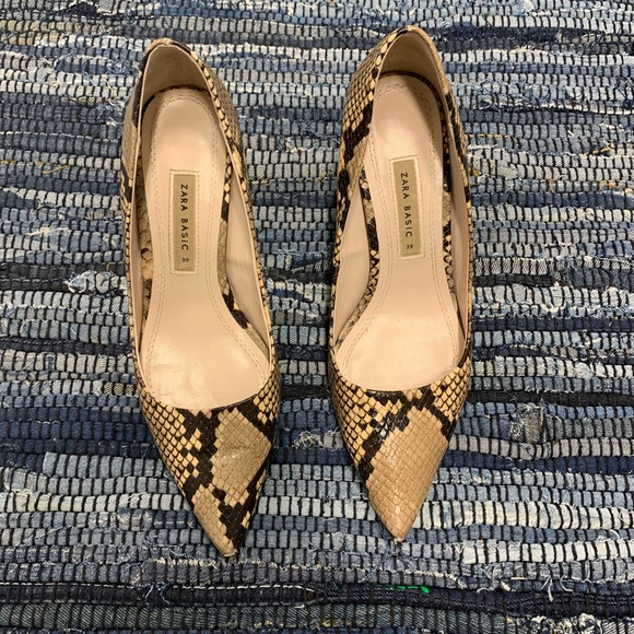 Pointed toe, 3” chunky heel. Python. Worn twice. I wear a Size 8 but these are a Euro 39 which is usually a 9 so I think they run small.