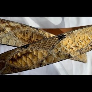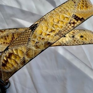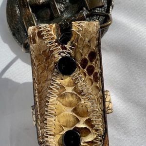 Size: 38 - Vintage - Rare find - used (normal wear) - no issues that affect the functionality of the belt - length including buckle: 44.5 inches - buckle is removable- Designer: Dan Post - Material: python leather on the front, cowhide leather on the back, buckle is solid burnt brass. From smoke free - pet free environment.
