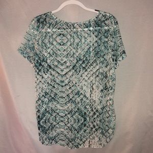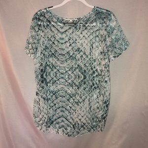 VICI Python blouse. Size large. Aqua/White/Charcoal. Side slits. Rayon.