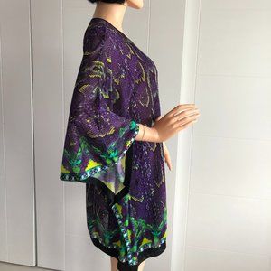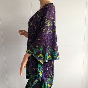 Electric Python print tunic in purple, neon green & yellow on black. Wide neck with peep hole pullover with batwing sleeves, loose fit. Size IT 38 measured flat fits 38" bust, waist & hips and is 31" long. Fits US size M or 8 comfortably. Can be worn as a mini dress or a long tunic top over leggings or skinny jeans. Fabric is 100% viscose, made in Italy, excellent used condition.