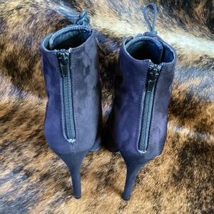 These are a great pair of sexy stick heels with zipper entry in the back, peep toe, and a cool lace up and tie design front. Unique and classy pair of date night or black tie event heels. Kinda like a cross between a heel and an ankle bootie! Fun pair of heels!