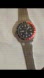 Stylish Quartz watch featuring a red and blue bezel. Classic design with a metal band.