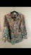 Chic blouse with vibrant floral patterns. Features a mix of blue, orange, and cream tones.