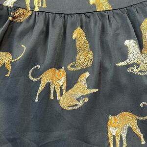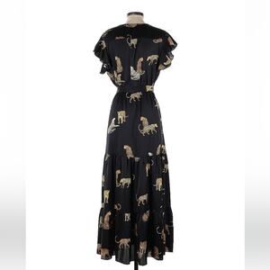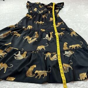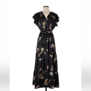 Black satin maxi dress with leopard print and ruffled hem. Wrap style bust, with elastic waist and detachable matching fabric belt. Flutter sleeves, pullover, no pockets.