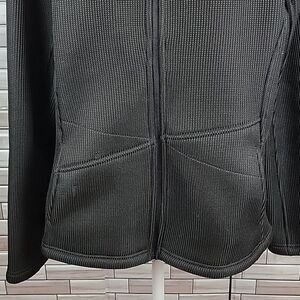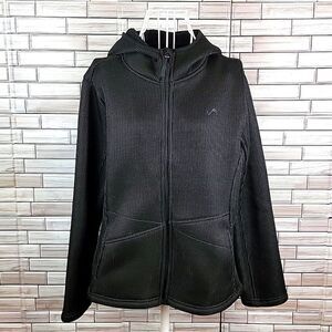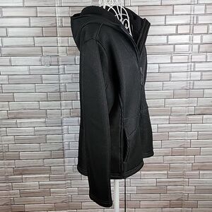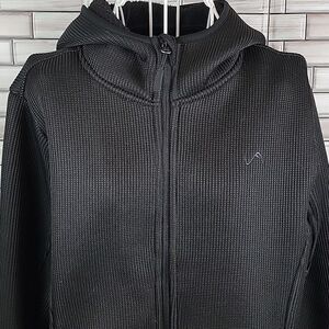 Fabric tag is missing but this is a heavyweight waffle knit fabric with fleece lining. Full zipper front to storm collar and hood with two front hand pockets. Good pre-owned condition. There is signs of normal wear including some fabric pulls. See pictures.