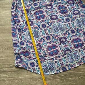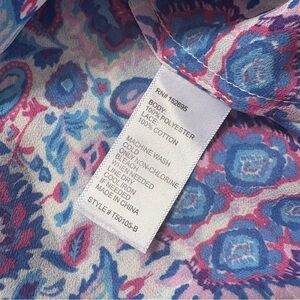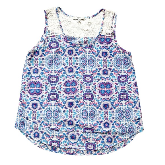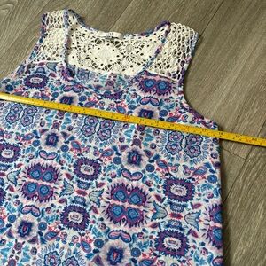 Beautiful Q&A women’s sleeveless blouse featuring a white crochet lace yoke neckline and a blue and pink floral/medallion pattern on a white background. Lightweight, sheer, and flowy with a flattering layered rounded hem.