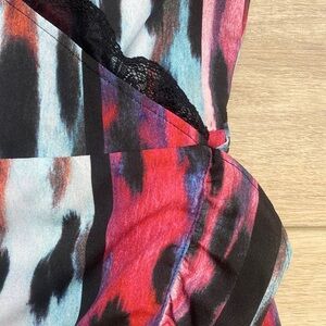 Stunning fuchsia and aqua abstract animal print striped wrap dress by Q & A Los Angeles. Sexy lace detail at the neckline meets a sweet ruffle hem in this show stopping and always flattering true wrap long high low maxi. Perfect for date night! In excellent condition, never worn, size S
