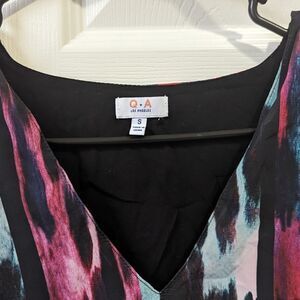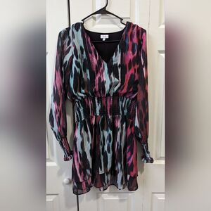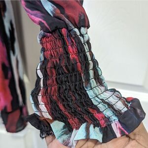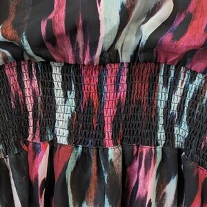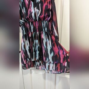 Q+A Los Angeles women's multi-color dress. Size Small. Smocked waist and sleeve. Ruffle level skirt. Sheer arms. Lined. Good condition