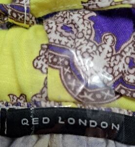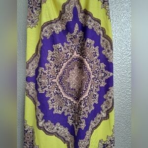 pre owned condition, yellow & blue pattern, hi/low, 95% polyester 5% spandex