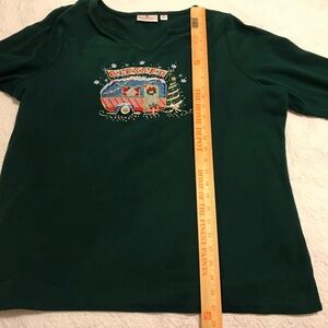 QF forest green 3/4 sleeve top with holiday camper — sparkly! (XL)