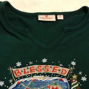 🎄🎄🎄 Rare Quacker Factory forest green 3/4 sleeve top embellished with a “blessed” camper van, decorated for the holidays complete with a Christmas tree, rich embroidery and clear and red rhinestones. Has a cute wrapped present waiting for you at the steps to the camper. Beautifully sparkly! Notched v-neck collar, rolled up sleeve ends. size XL, nicely stretchy (typical QF). Instructions say turn inside out, hand wash, suggest wash in cold, delicate cycle, (may want to use a garment bag), dry flat. I actually never got a chance to wear it, it’s in perfect shape. Almost a tunic length. Measurements and materials in pics. Can’t find any missing rhinestone spots. Can dress this up or go casual, but looks nice with navy blue slacks by itself or with a blue, red or green cardigan or jacket. Try with a velvet blazer, would look gorgeous! No one can say you don’t have the Christmas spirit—perfect for a holiday party, or just out Christmas shopping with friends! 🎄🎄🎄