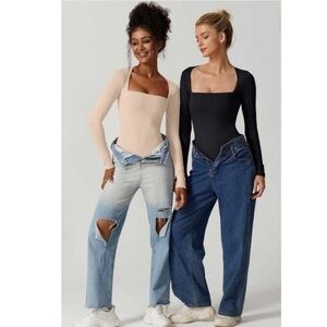 QINSEN NWT Tan Neutral Square Neck Long Sleeve Bodysuit Minimal Seamless Small