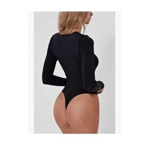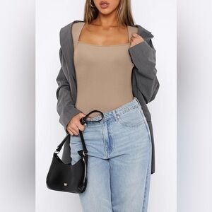 QINSEN NWT Tan Neutral Square Neck Long Sleeve Bodysuit Minimal Seamless Small. Very minimalist capsule wardrobe soft stretchy body suit! Great for layering or wearing alone. Thong bottoms and NEW with tag condition. No flaws