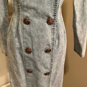 QS International Military-Style Denim Dress - Size 7/8. Long sleeves. Excellent condition. No flaws. Acid-washed Denim with gold lapel trim, gold buttons and gold studs. 100% Cotton. 35 inches long from shoulder. 19 inches from front pit to pit. 28 inch waist. All measurements are approximate. Vintage 1980s.