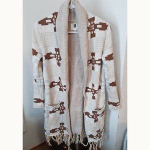 Up for grabs is a beautiful Quicksilver long-lined Cardigan sweater from Buckle. The tags have been removed but it has never been worn. It is in brand new condition. It has a shawl collar and tassels framing the bottom. It has a boho vibe with a beautiful Aztec print. It is one of a kind! The size is XS but it could also fit a size Small since it is open. Measurements lying flat: arm pit to arm pit: 17" Length: Shoulder to bottom of tassels: 34"