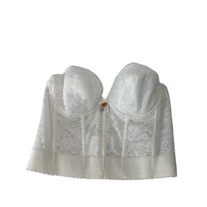Vintage White floral lace boned strapless corset bra. Hook and eye closure at back.