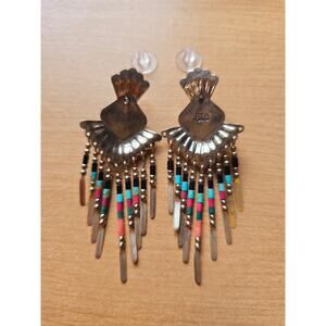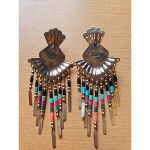 These vintage earrings showcase a striking Southwestern design featuring colorful inlays of turquoise, coral, and other stones accented with intricate fringe drops for a bold, dynamic look. These dangling elements add movement and a dramatic flair, making them perfect for making a statement that reflect a fusion of traditional Southwestern design and boho elegance, making them unique and eye-catching.