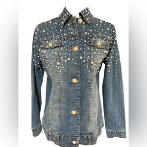 This is a beautiful Jean jacket with pearl and rhinestone embellishments! Not your ordinary denim jacket , stand out from the crowd with this cotton/ spandex country vibe jacket ! # NASHVILLE NIGHTS # Bachelorette parties # Country concerts. Pre owned in excellent condition, only worn once . This fits larger than a XS , it fits up to a medium+ 24” length, 20” ptp ,very roomy and generous fit , comfortable with the stretch of spandex .Great condition, looks brand new!