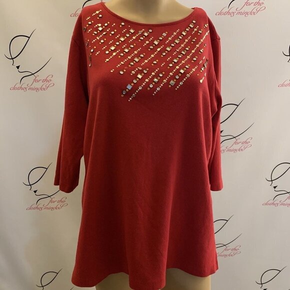 QUACKER FACTORY. Size Large. Embellished 3/4 Sleeve Cotton Pullover. Shoulder to hem 28". 3/4 sleeve 15.3". Bust 22.5/45". (Armpit to armpit X2 - Taken with tailor's tape so could have a bit of play. Please add your preferred amount of ease.) Hand wash. Rhinestones/studs. Very good pre-loved condition. No damage that I can see.