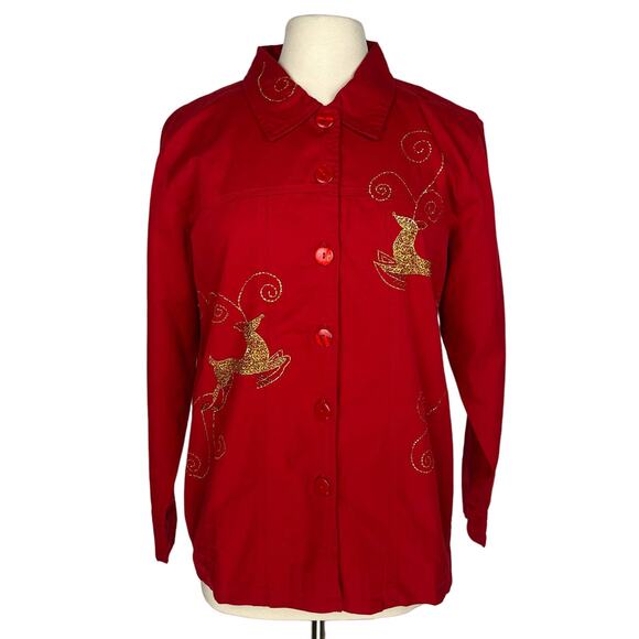 QUAKER FACTORY | Red Christmas Gold Sequin Embroidered Reindeer Jacket | Women's