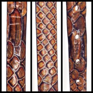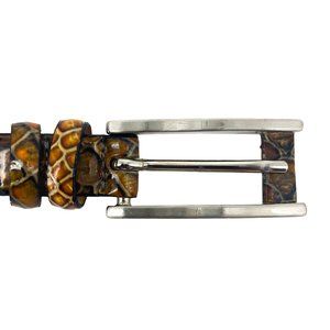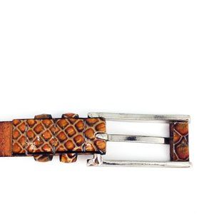 Qualheim Bollorini Leather Snakeskin Belt is a genuine leather belt with a rectangular sleek buckle and snake scale design. Made in Italy. Great statement belt to wear with sweaters, cardigans, blouses and dresses.