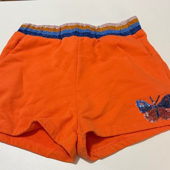 Bright orange shorts with a sparkling butterfly design. Features a vibrant striped waistband. Perfect for fun outings.
