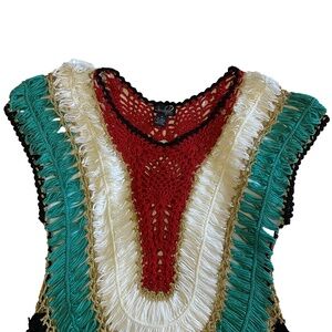 Keywords: crochet festival top, metallic boho blouse, rainbowcore gypsy shirt, handmade crochet tunic, colorful open-weave top, Y2K revival