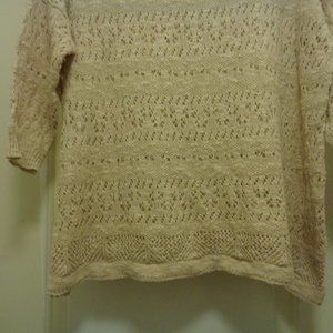 QUIET LUXURY BEIGE MACHINE OPEN CROCHET DESIGNS W TINY BUTTONS ON NECK BY COEN F. F IS ASIAN FREE SIZE.ALL THE WAY AROUND THE PIECE IS 55 TO 56 INCHES. A FREE SIZE IS USUALLY A M. HOWEVER THIS ONE IS A DRAPED X LG. MADE IN CHINA. THE FABRIC IS POLYESTER. WITH SOME WEAR YET PLENTY TO SHARE WITH YOU LUCKY BUYER. ENJOY THE NEW NEUTRAL LOOKS. 3RD GROUP. #685. THANKS