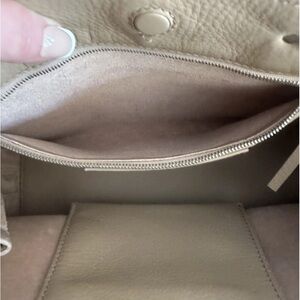 The shiny mark in last photo that shows two light spots on suede is a button not a hole. This bag is in excellent condition.