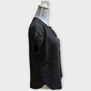 Elevate your casual wardrobe with this QUINCE short sleeve gauze top in classic black. Made from lightweight, breathable double-gauze cotton with a soft, crinkled texture, this top features a button-front placket, round neckline, and relaxed fit. Perfect for everyday wear, travel, or layering.