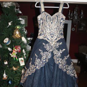 Gently used size 8 Quinceanera dress plus the doll, hairpin, table bottle, photo album book, bouquet. The straps were custom made and can be removed for the dress to be strapless. This is a Mary's Quinceanera collection dress (STYLE: MQ1035). It is an opulent metallic lace and tulle gown with a strapless sweetheart neckline, fully appliqued bodice, delicate beading, with a lace-up back closure. This dress is midnight blue and gold color combo.