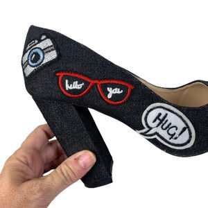 QUPID Black Queen Bee Patch Signal Block Heel Pumps