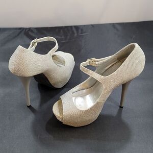 QUPID PEEP TOE HIGH HEEL STILETTOS WOMEN"S PUMP SIZE 5 COLOR SILVER SHIMMER GLITTER METALLIC ADJUSTABLE BUCKLE ANKLE STRAP MADE WITH ALL MAN-MADE MATERIALS HEEL HEIGHT MEASUREMENTS APPROX 5"INCHES THIS ITEMS IS PRE-OWNED EXCELLENT CONDITION WITH ONLY LIGHT SIGNS OF WEAR IF ANY THE PICTURES (FYI THE FIRST PICTURES IS JUST A MODEL TO SHOW WHAT THE SHOE LOOK ON CHECK THE PICTURES)