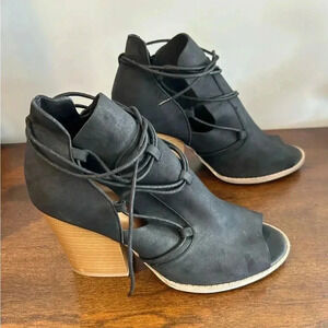 QUPID Peep-Toe Chunky Heeled Sandals Faux Suede 3.7 Inch Heel. Size 8.5 US EUC.