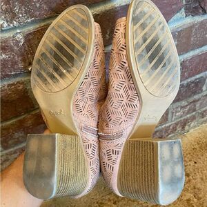 Qupid rose Taupe Half d'Orasy Peep Toe side zip laser cut Perforated Booties. Good used condition, 2.5” stacked block heel, rubber soles, side zip, see pictures for details.