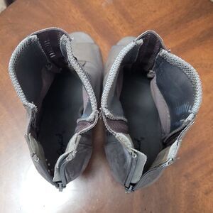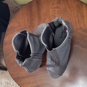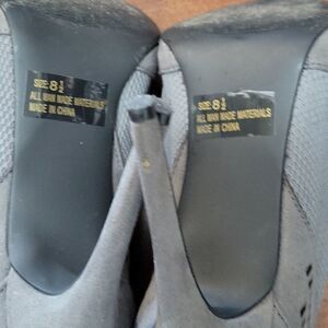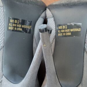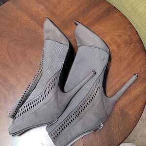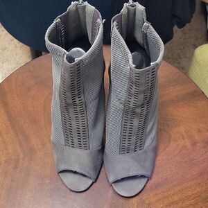 QUPID FAUX SUEDE HIGH HEEL BOOTIES BACK ZIPPER CLOSURE OPEN TOE SIZE 8 1/2 COLOR GRAY MADE WITH ALL MAN MADE MATERIALS HEEL MEASUREMENTS APPROX 5"INCHES (LITTLE TINY DAMAGE IN ONE OF THE HEEL OF THE BOOTIES)BESIDES THAT THIS ITEMS IS PRE-OWNED EXCELLENT CONDITION YOU MIGHT MISTAKE FOR NEW CHECK THE PICTURES