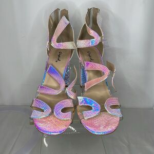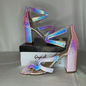 QUPID SILVER IRIDESCENT HOLOGRAM HEEL SANDALS