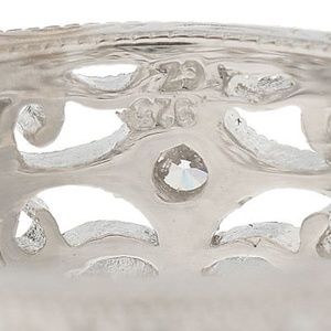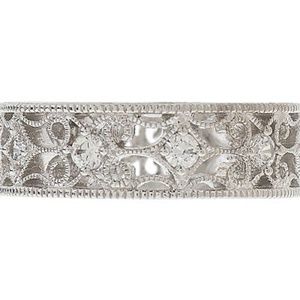 This understated yet intricately detailed ring twinkles with approximately 50 points of small, round Diamonique(R) simulated diamonds bead- and prong set throughout the lace design. Even the inside of the shank is finished with a cut-out lace pattern. Engraved and milgrain accents give the piece the signature Tacori touch.